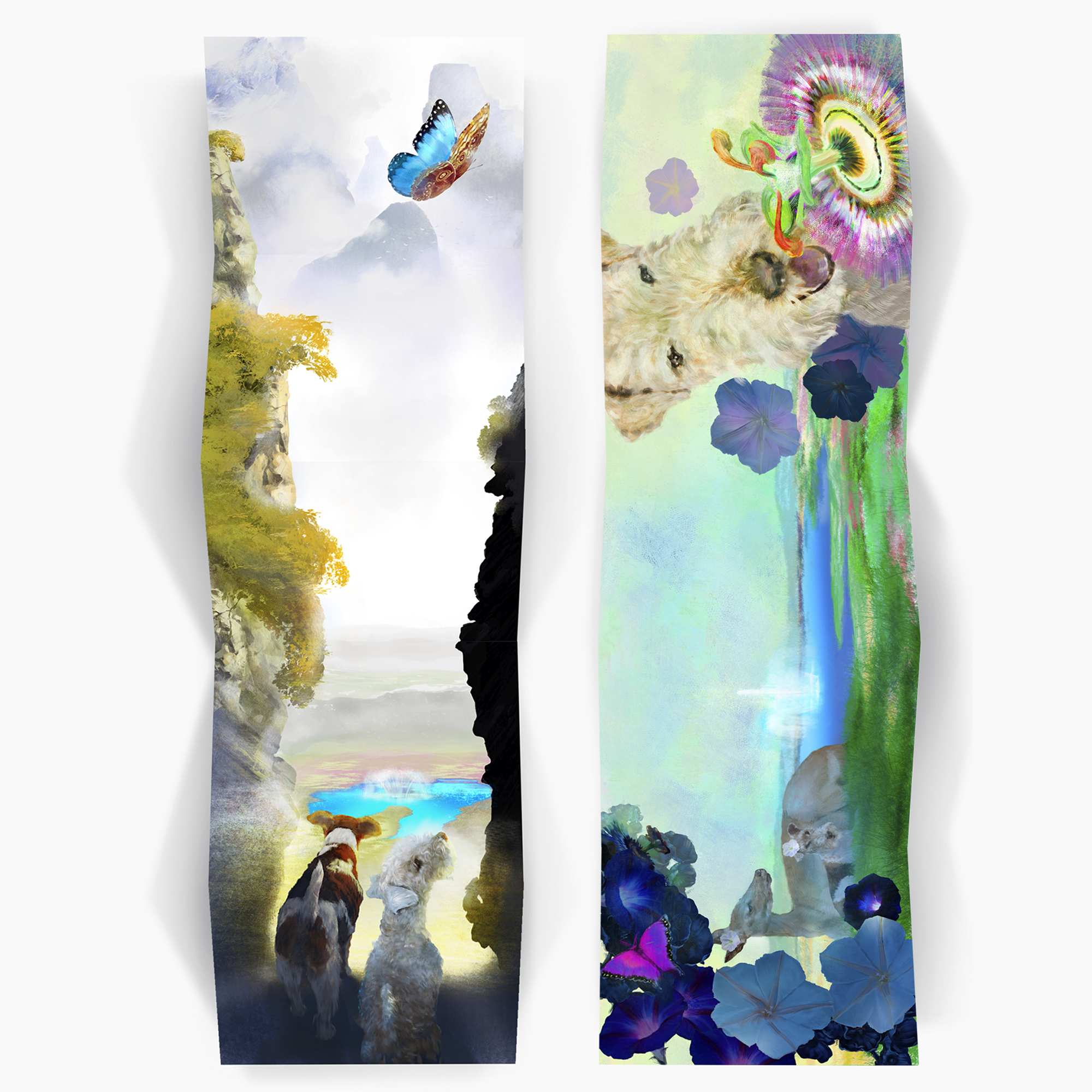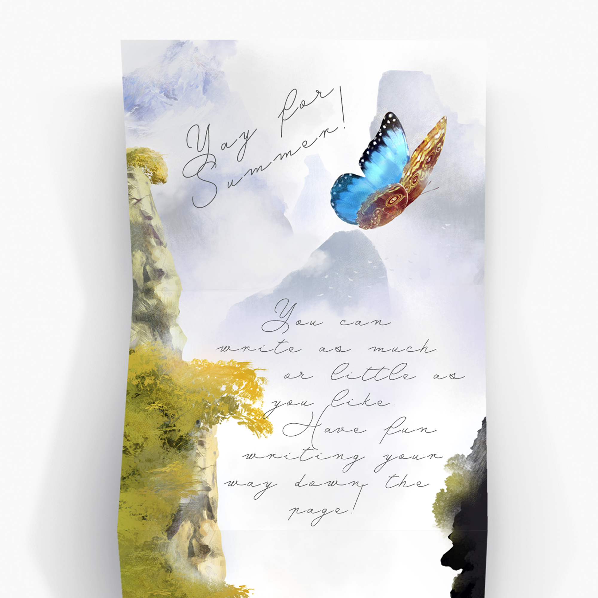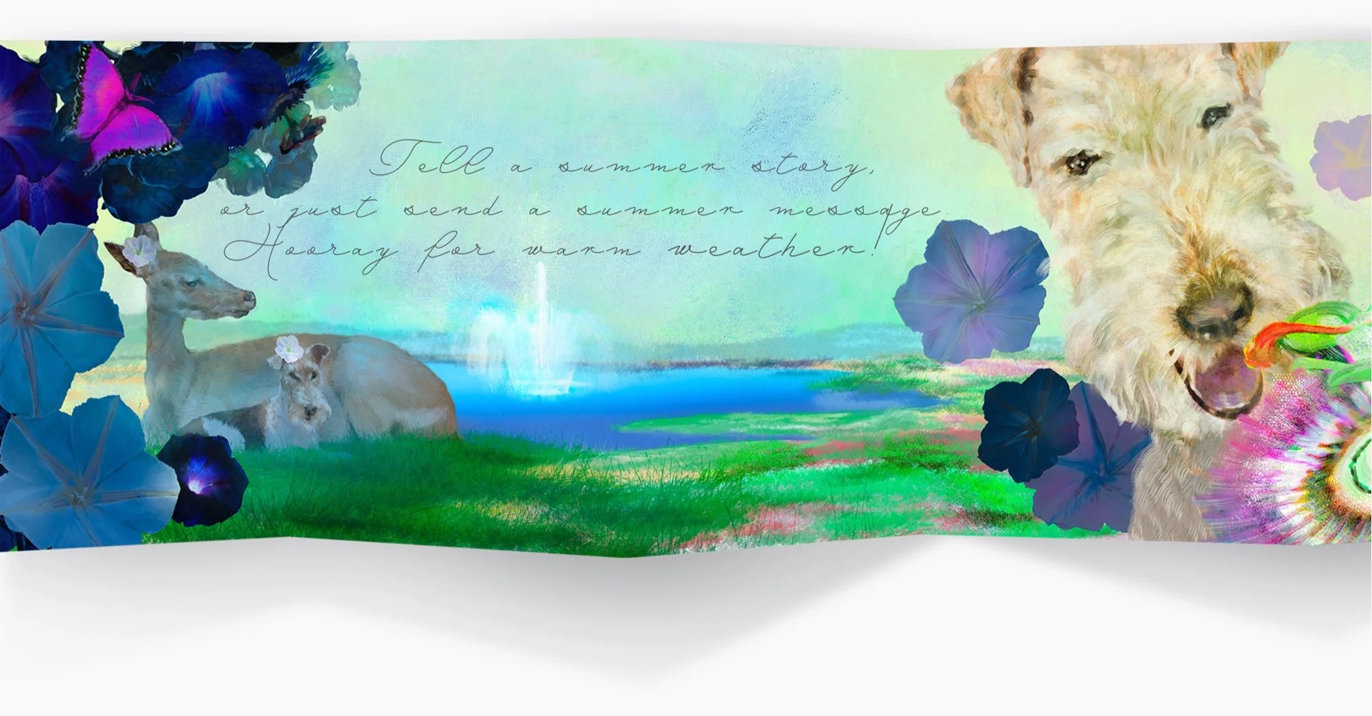 Bonjour there. Well, here in the desert, we don’t really talk about summer the way I’m going to here, but I know lots of people actually don’t live here. Really. I suspect it’s true. But anyway, here’s a new card about Summer everywhere. The Summer of the mind. You know, fun, lazy relaxation, playing, naps and cookies! So this card is different, it’s a “turn for the better.” It starts out to be a vertical and then turns to a horizontal on the back. I know, it’s crazy. But it’s the only way we could get the bit in on the back about the crazy Passion flower chaser. You’ll see what I mean…