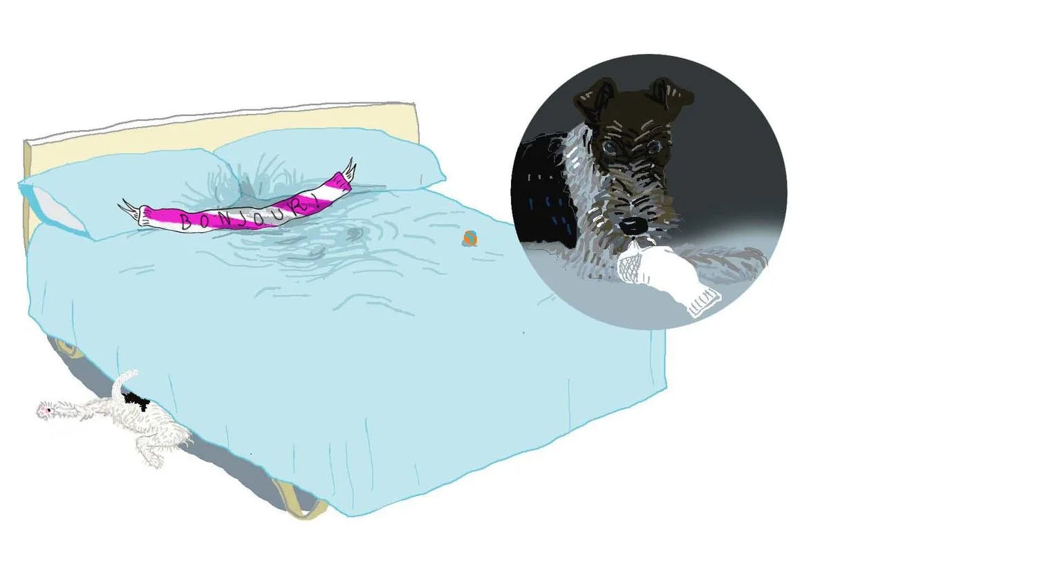 Bonjour there. I'm talking from under their bed today. That's my safe place. It's where I keep my REALLY secret stash. I have them fooled. Even my companion, the “Other One.” I play with my new toys on top of the bed. But then I sneak down under the bed to play with my best stuff. Socks that have been worn. Bits of leaves that I sneak in. Sometimes underwear. I even got a nightgown. Funny how my stash always disappears. That's why I have to go get more all the time. but I really have them all fooled. That's the best part.