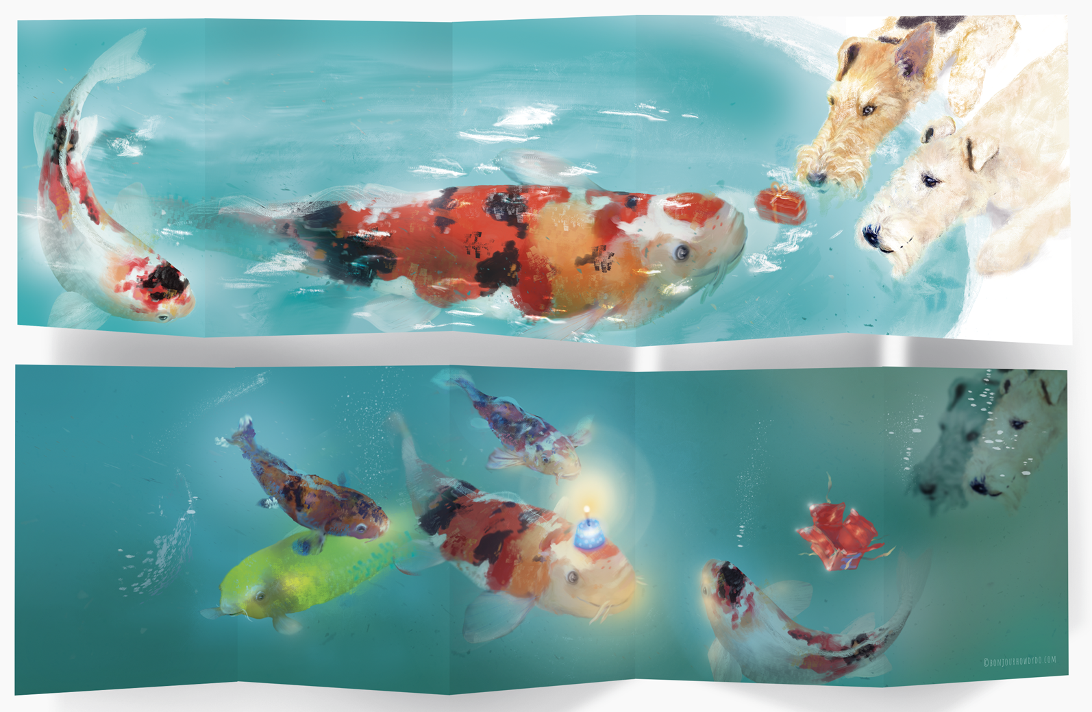Bonjour there. It’s still winter, but there’s no reason to walk around with our eyelids half closed. We can have a Koi Birthday! Ok, maybe we don’t have a birthday coming up, BUT, we can plan for the next one with our friends the Koi. They have birthdays all the time. Some Koi are even bigger than me! I guess it takes a lot of birthdays to get there. Wow, that’s an amazing fish! They are so fashionable. They have so many different outfits. It’s something I envy about them. Don’t tell my breeder I said that, ok?